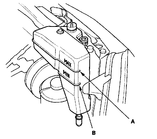 1. Look at the coolant level in the reserve tank. Make sure it is between the MAX mark (A) and MIN mark (B).