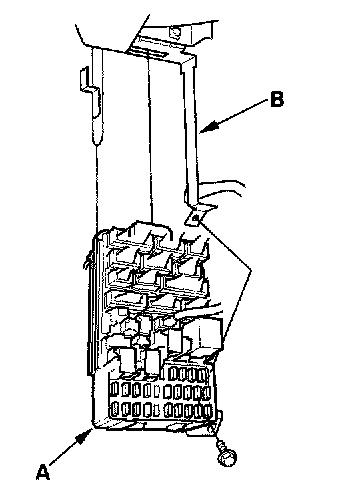 5. Remove the mounting bolt and slide the under-dash fuse/relay box (A) down from the bracket (B).