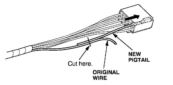 6. Lay the pigtail and the original wire side-by-side, and cut off both ends at once. If you are making more than one splice, do not cut each pigtail at the same location; the resulting "lump" of splice connectors would interfere with rewrapping the harness. Instead, cut the first pigtail close enough to the terminal so you will have room to make each remaining cut about 20 mm (3/4 inch) farther down on the next pigtail.