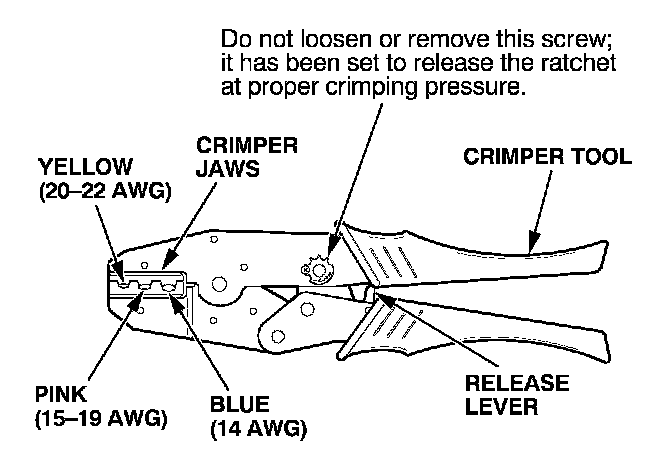 8. Put the splice connector in the proper size slot in the Crimper Tool, slide it to one end (where the flare begins), and close the crimper handles far enough to hold it in place. To release the ratchet mechanism at any point after the first click, squeeze the handles slightly and push the release lever, then let the handles open.