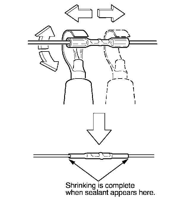 13. Plug in the heat gun, and turn it on. Start at the middle of the splice connector, and move the gun toward the ends as the tube shrinks. Apply heat evenly by rotating the curved heat spreader around the splice connector. Shrinking is complete when a small amount of sealant appears at each end of the tube.