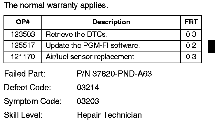 *Update the PGM-FI software with the HDS. Replace the air/fuel sensor.*