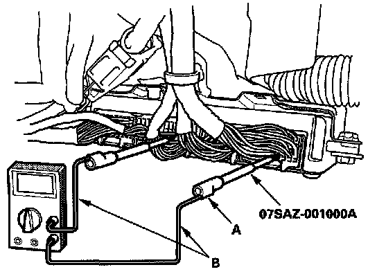 3. If you cannot get to the wire side of the connector or the wire side is sealed (A), disconnect the connector and probe the terminals (B) from the terminal side. Do not force the probe into the connector.