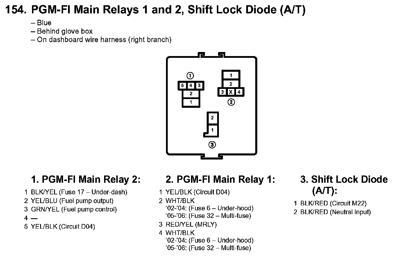 154. PGM-FI Main Relays 1 And 2, Shift Lock Diode (A/T):