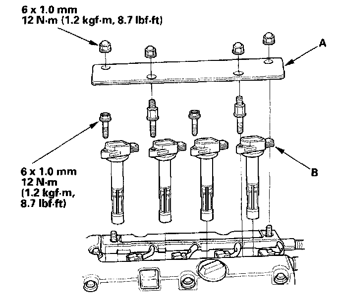 cover (A), then remove the ignition coils (B).