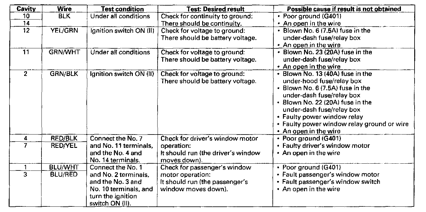 Master Switch Input TestNOTE: The power window control unit is built into the power window master switch, and it only controls the driver's window operations.