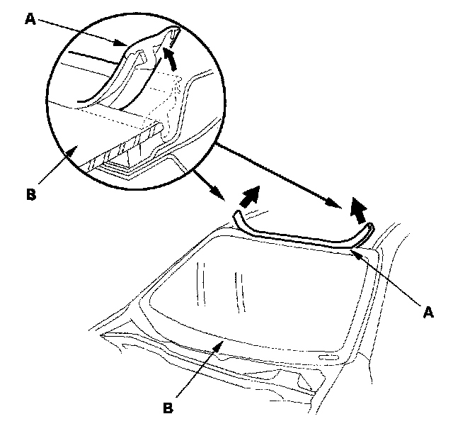 3. Remove the molding (A) from the upper edge of the windshield (B). If necessary, cut the molding with a utility knife.