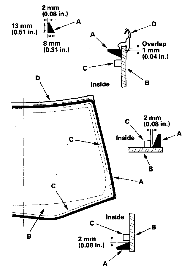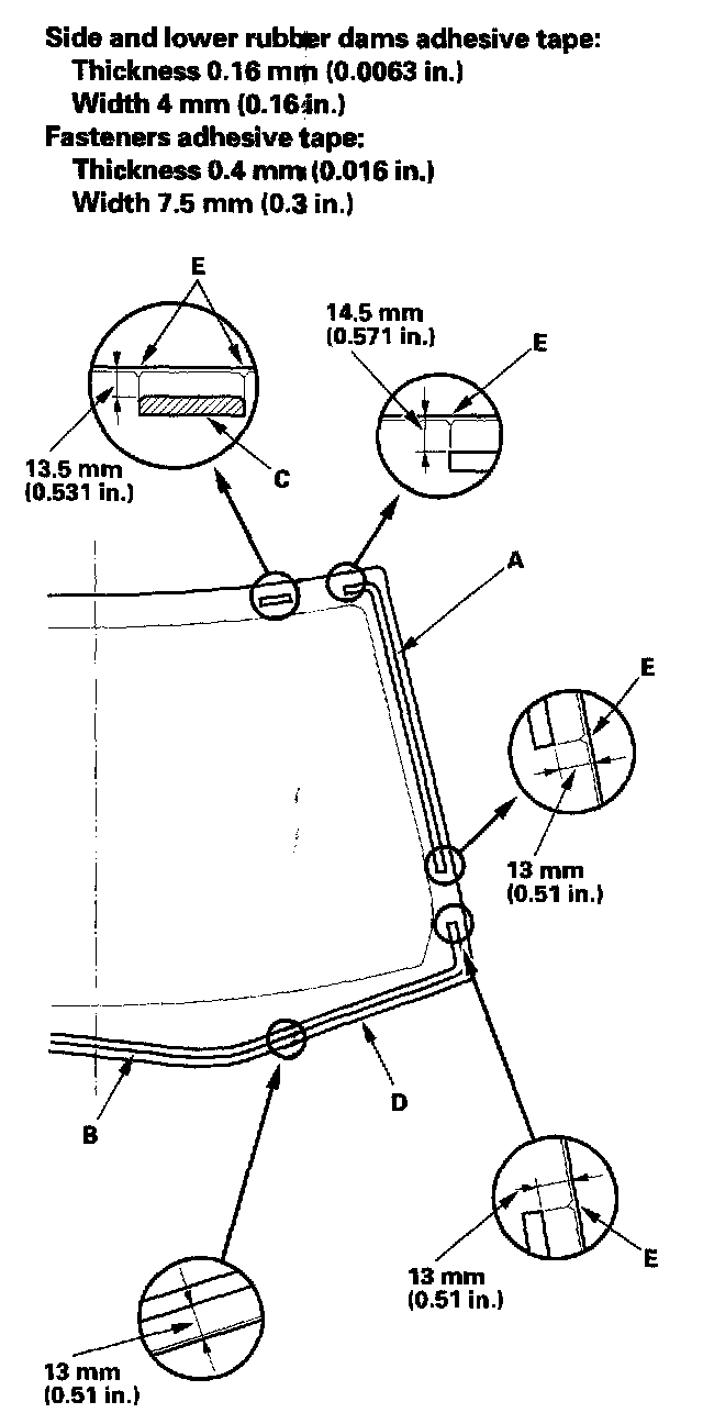 12. Attach the side rubber dams (A), the lower rubber dam (B), and the fasteners (C) with adhesive tape to the inside face of the windshield (D) as shown:
