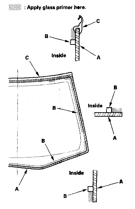 17. With a sponge, apply a light coat of glass primer around the edge of the windshield (A) between the dams (B) and molding (C) as shown, then lightly wipe it off with gauze or cheesecloth: