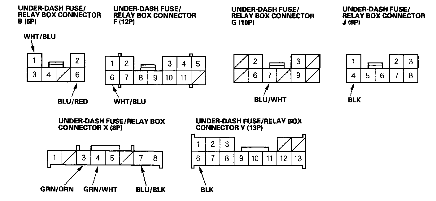 6. Disconnect the X connector from the under-dash fuse/relay box, and make this input test at the connector. If this input test proves OK, the multiplex control unit must be faulty; replace the under-dash fuse/relay box assembly.