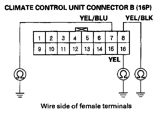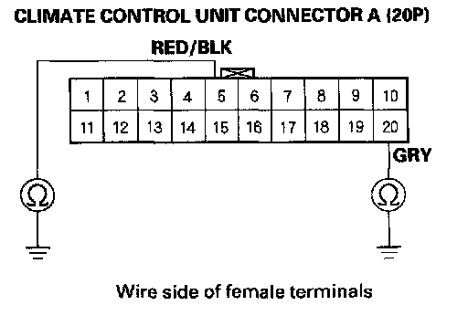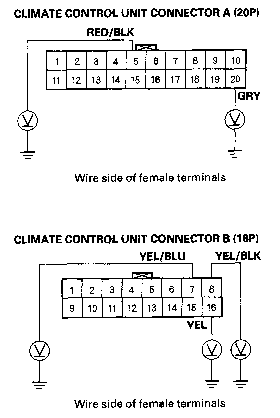 8. Check for continuity between body ground and climate control unit connector A (20P) terminals No. 5 and 20 individually, and between body ground and climate control unit connector B (16P) terminals No. 7, 8 and 16 individually.