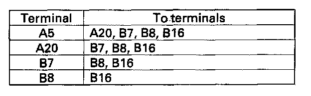 9. Check for continuity between the terminals of climate control unit connector A (20P) and B (16P) as follows.