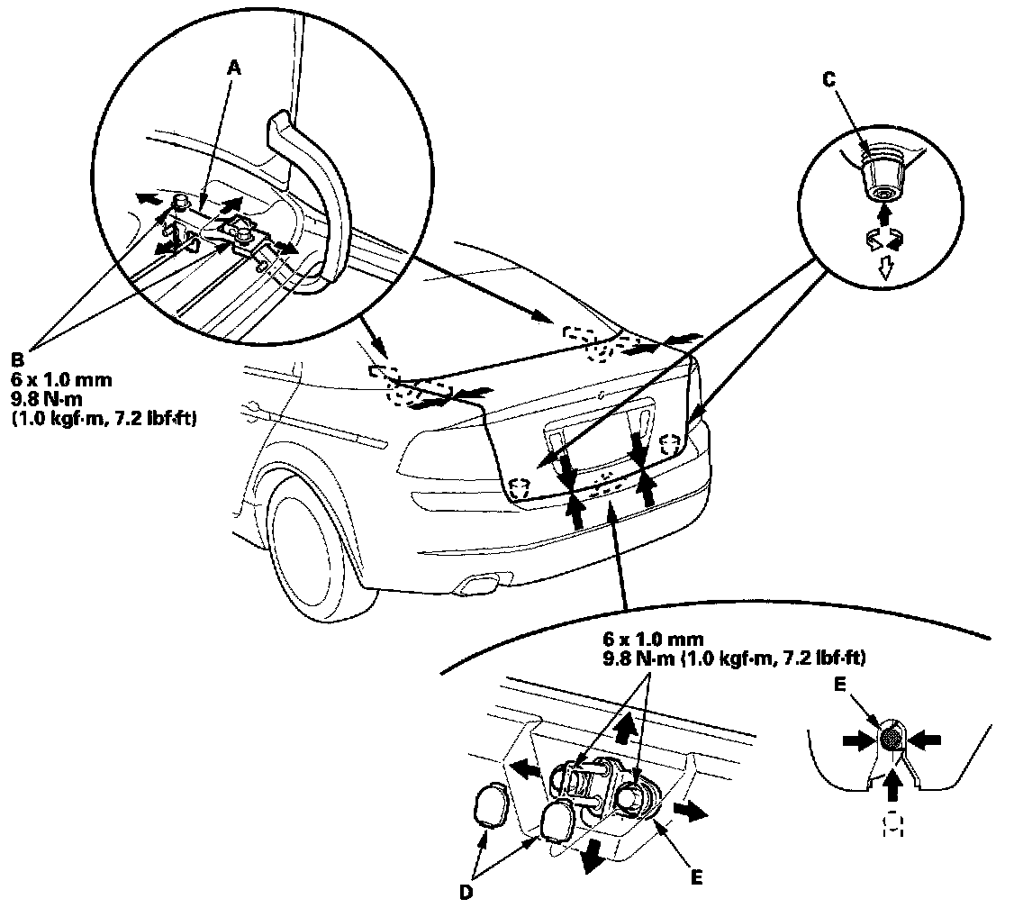 - Adjust the fit between the trunk lid and the trunk lid opening by moving the striker (E).