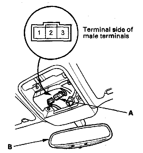 2. Disconnect the 3P connector (A) from the automatic dimming inside mirror (B):