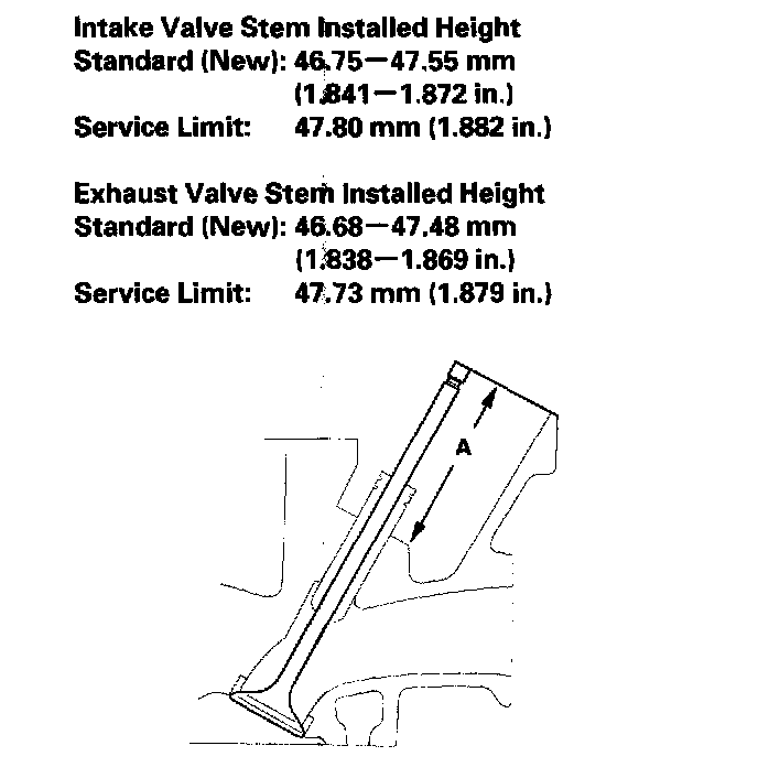 9. If the valve stem installed height is over the service limit, replace the valve and recheck. If it is still over the service limit, replace the cylinder head; the valve seat in the head is too deep.