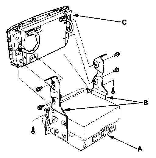 2. Remove the self-tapping screws and the audio unit (A) and bracket (B) from the display panel control unit (C).