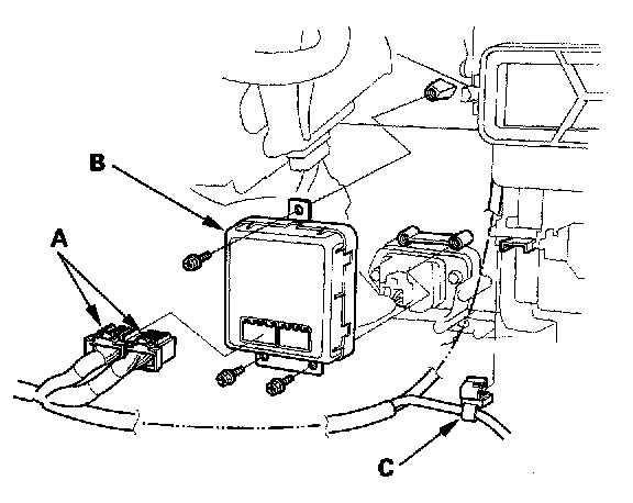 4. Disconnect the connectors (A) from the climate control unit (B), then remove the wire harness clip (C), the self-tapping screws and the climate control unit.