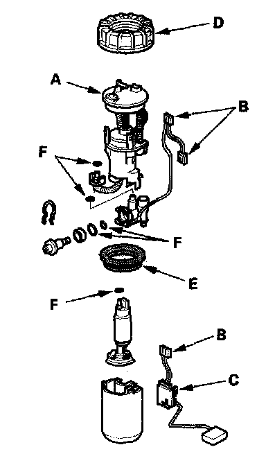 4. Install the parts in the reverse order of removal with a new locknut (D) a new base gasket (E), and new O-rings (F). When installing the fuel tank unit, align the marks on the unit and the fuel tank.