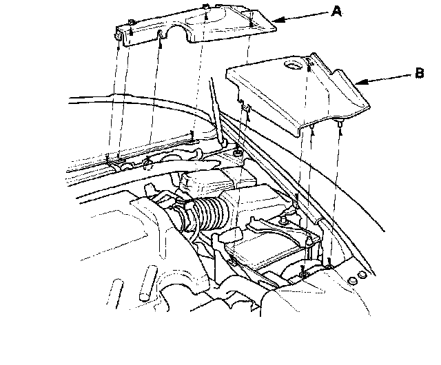 6. Remove the left rear engine compartment cover (A) and the left side engine compartment cover (B).