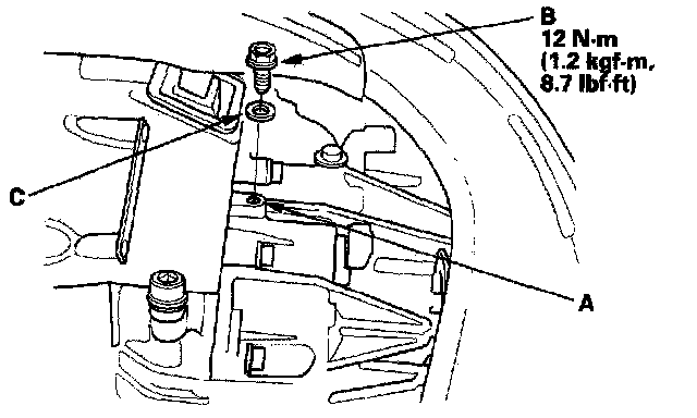 12. After the fluid stops overflowing, install the oil check bolt (B) with a new washer (C).