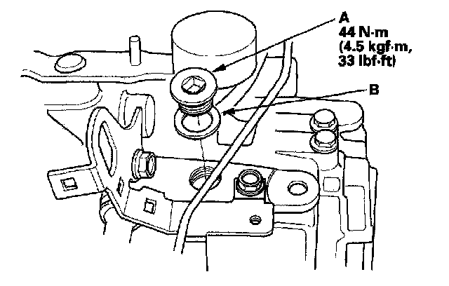 11. Refill the fluid from the oil filler plug hole of the transmission, and until the transmission fluid overflows from the oil check bolt hole (A).