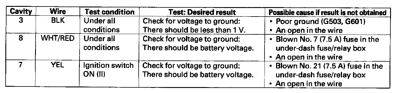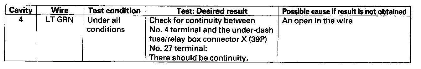 5. Disconnect the connector from the wiper/washer switch, and make these input tests at the connector.