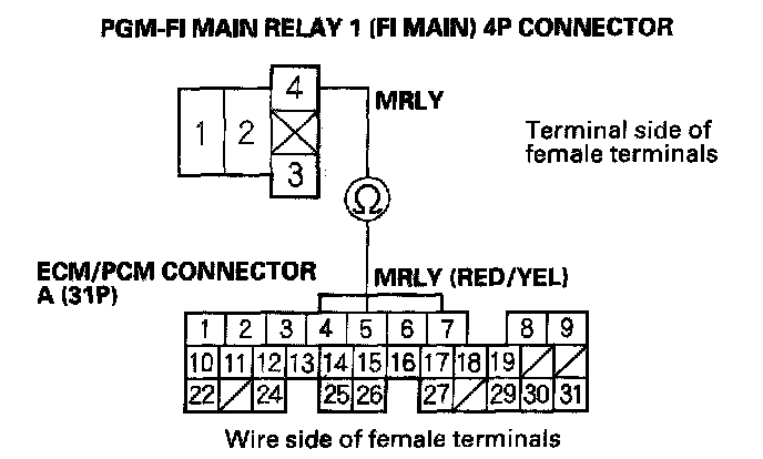 27. Check for continuity between body ground and PGM-FI main relay 1 (FI MAIN) 4P connector terminals No.2 and No.3 individually.