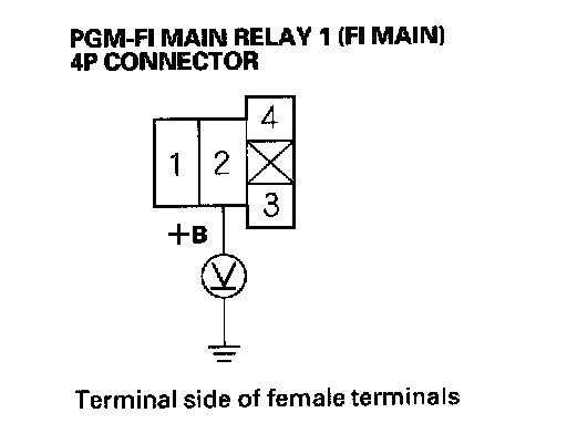 59. Measure voltage between PGM-FI main relay 1 (FI MAIN) 4P connector terminal No.2 and body ground.