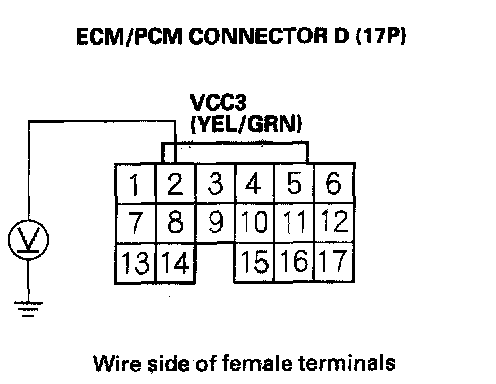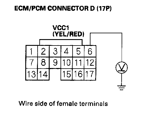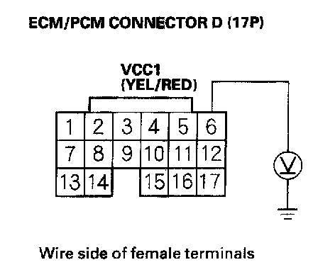 65. Disconnect the connector from each of these sensors, one at a time, and measure voltage between ECM/PCM connector terminal D6 and body ground with the ignition switch ON (II).