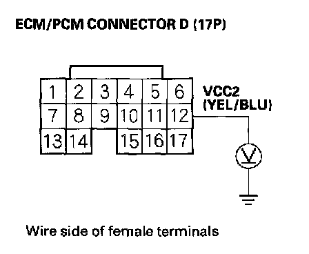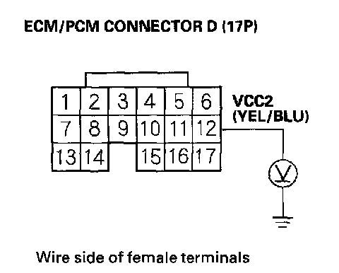 73. Disconnect the connector from each of these parts, one at a time, and measure voltage between ECM/PCM connector terminal D12 and body ground with the ignition switch ON (II).