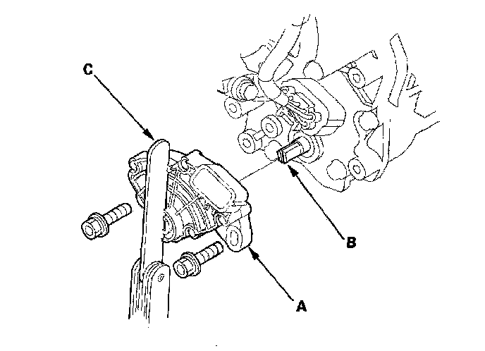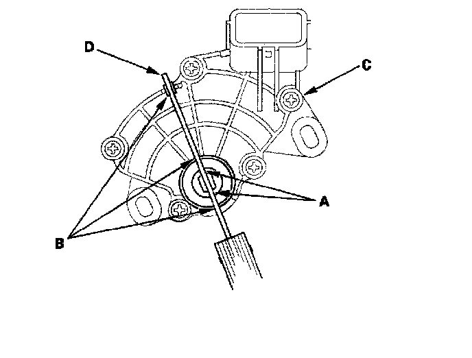 7. Align the cutouts (A) on the rotary-frame with the neutral positioning cutouts (B) on the transmission range switch (C), then put a 2.0 mm (0.08 inch) feeler gauge blade (D) in the cutouts to hold the switch in the N position.