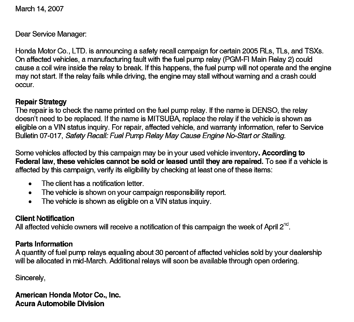 Recall - Fuel Pump Relay Inspection/Replacement