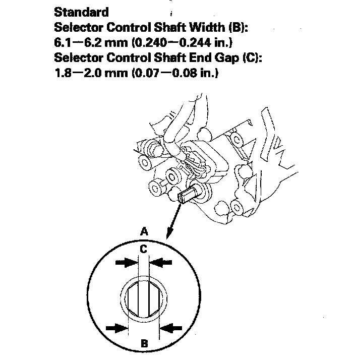 7. The measurement of the selector control shaft end is within the standard, replace the transmission range switch. If the measurement is out of the standard, repair the selector control shaft end, and recheck the transmission range switch continuity.