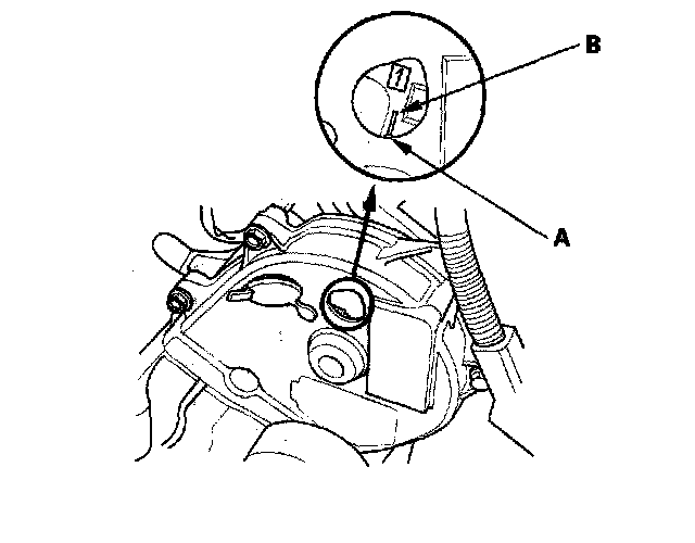 8. Rotate the crankshaft clockwise. Align the pointer (A) on the front upper cover with the No. 4 piston TDC mark (B) on the front camshaft pulley.