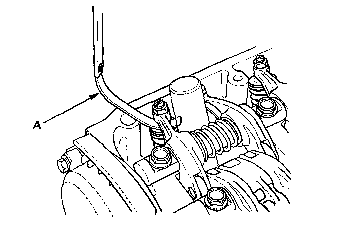 5. Insert the feeler gauge (A) between the adjusting screw and the end of the valve stem on No. 1 cylinder and slide it back and forth; you should feel a slight amount of drag.