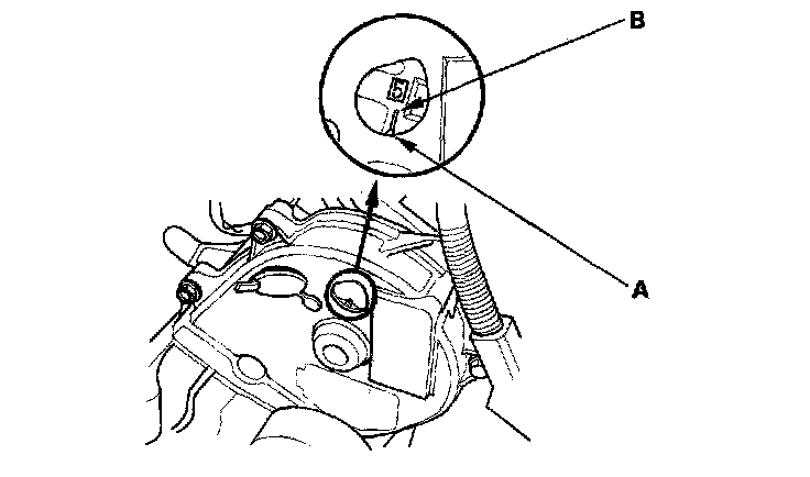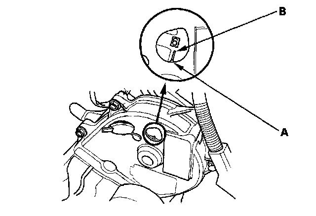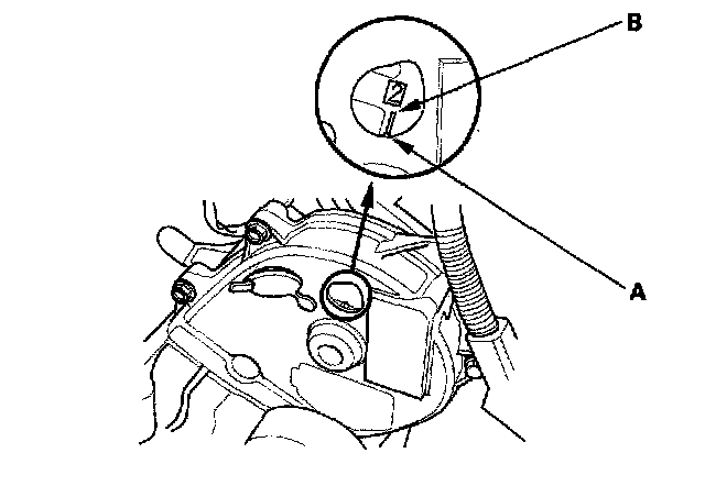 12. Rotate the crankshaft clockwise. Align the pointer (A) on the front upper cover with the No. 5 piston TDC mark (B) on the front camshaft pulley.