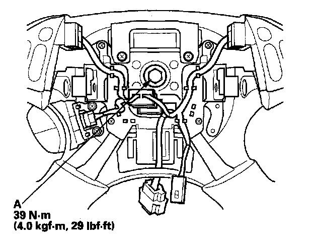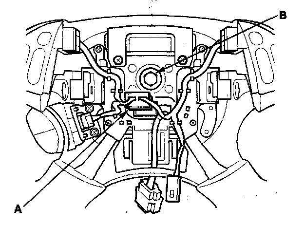 4. Disconnect the connector (A) from the cable reel, then remove the steering wheel bolt (B).