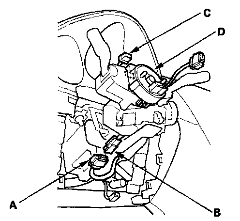 9. Disconnect the dashboard wire harness 4p connector (A) from the cable reel 4P connector (B), then disconnect the dashboard wire harness 13P connector (C) from the cable reel (D).