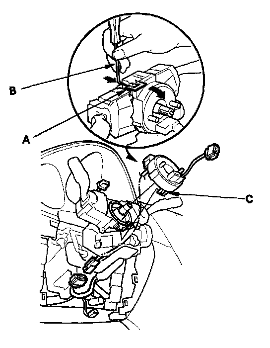 10. Release the lock tab (A) under the cable reel connector with a 90 Degrees hook shaped tool (B). Slide the tool below the cable reel connector just above the lock tab. Release the lower lock tab (C), and slide the cable reel off the column.