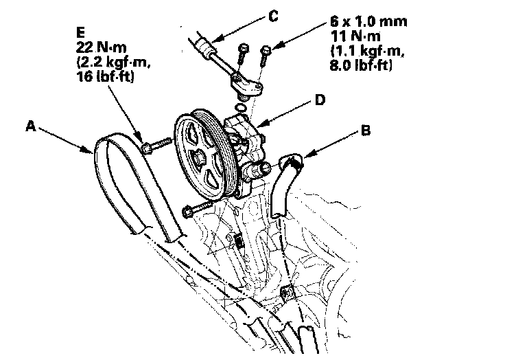 6. Cover the auto-tensioner, alternator, and A/C compressor with several shop towels to protect them from spilled power steering fluid. Disconnect the pump inlet hose (B) and pump outlet hose (C) from the pump (D), and plug them. Take care not to spill the fluid on the body or parts. Wipe off any spilled fluid at once. Do not turn the steering wheel with the pump removed.