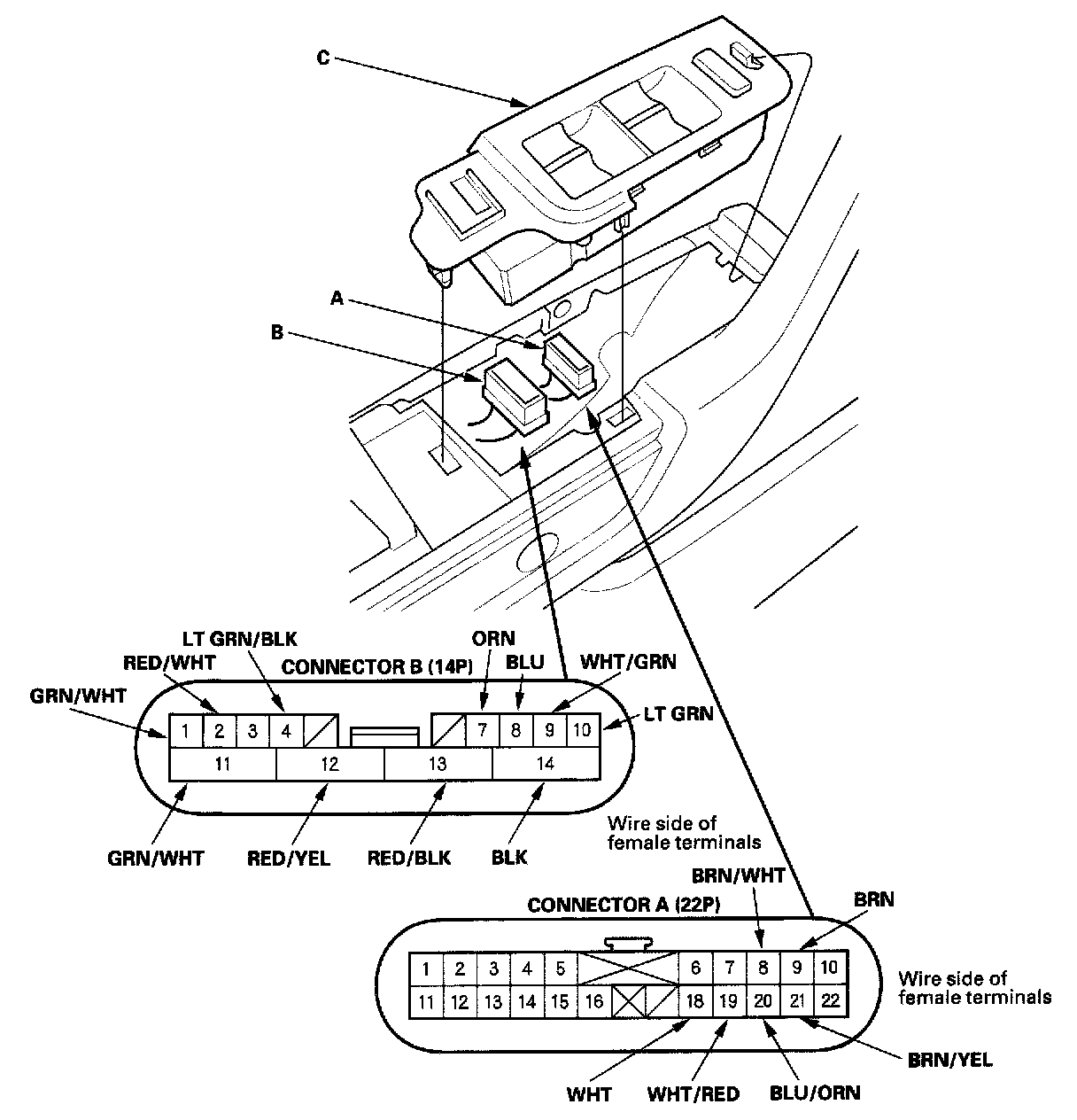 4. Disconnect the 22P connector (A) and 14P connector (B) from the power window master switch (C).