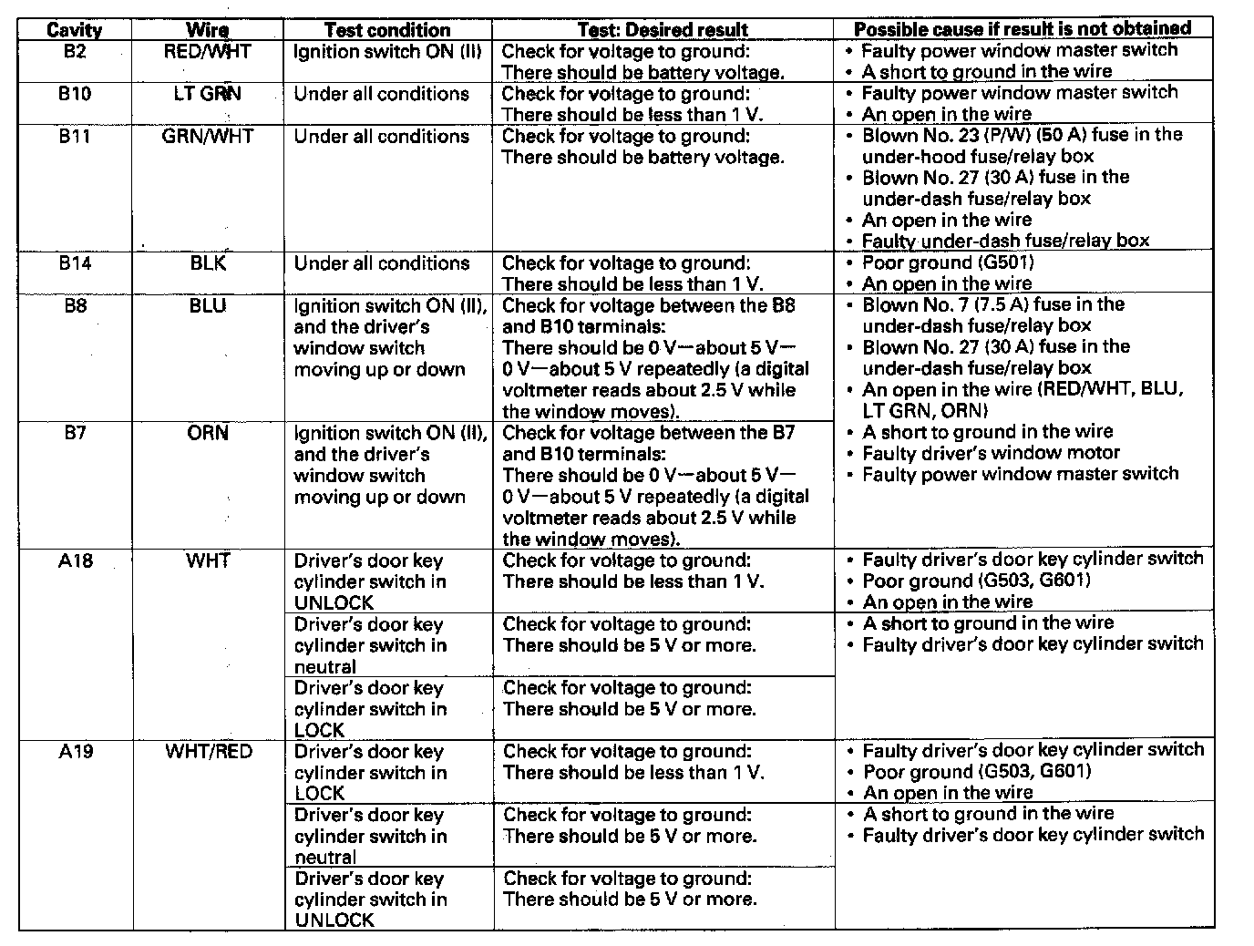 7. Disconnect the power window master switch connector A (22P), and make these input tests at the connector.