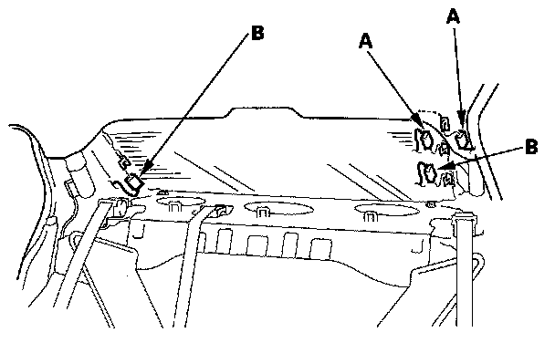 4. Pull down the rear portion of the headliner (A) by detaching the clips (B). Take care not to bend the headliner excessively, or you may crease or break it.
