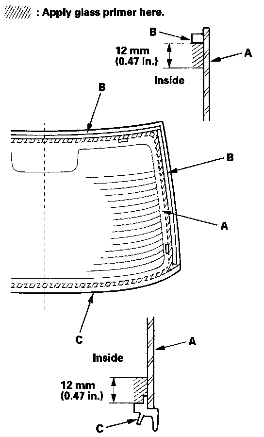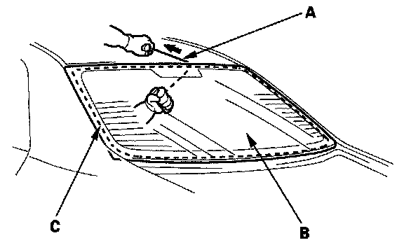 17. With a sponge, apply a light coat of glass primer along the edge of the rear window (A) between the dams (B) and molding (C) as shown, then lightly wipe it off with gauze or cheesecloth: