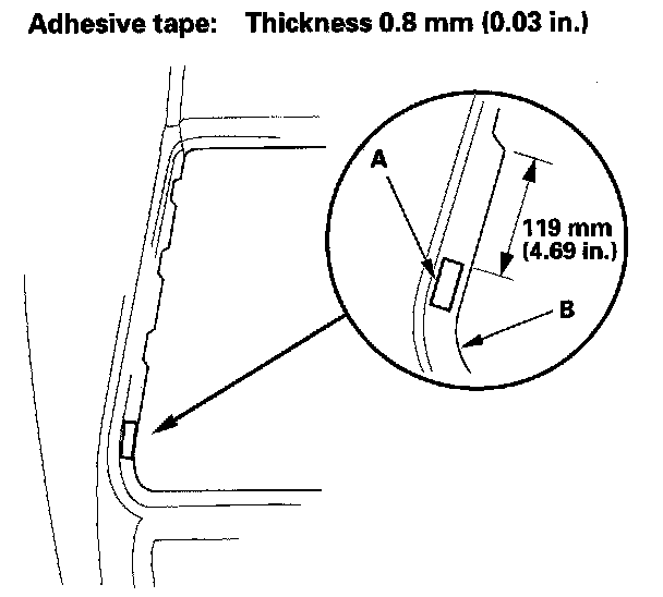 14. Attach the fasteners (A) with adhesive tape to the rear window opening flange (B) of the body on both sides.