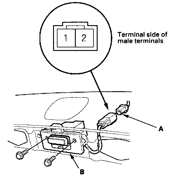 2. Disconnect the 2P connector (A) from the trunk lid opener switch (B).