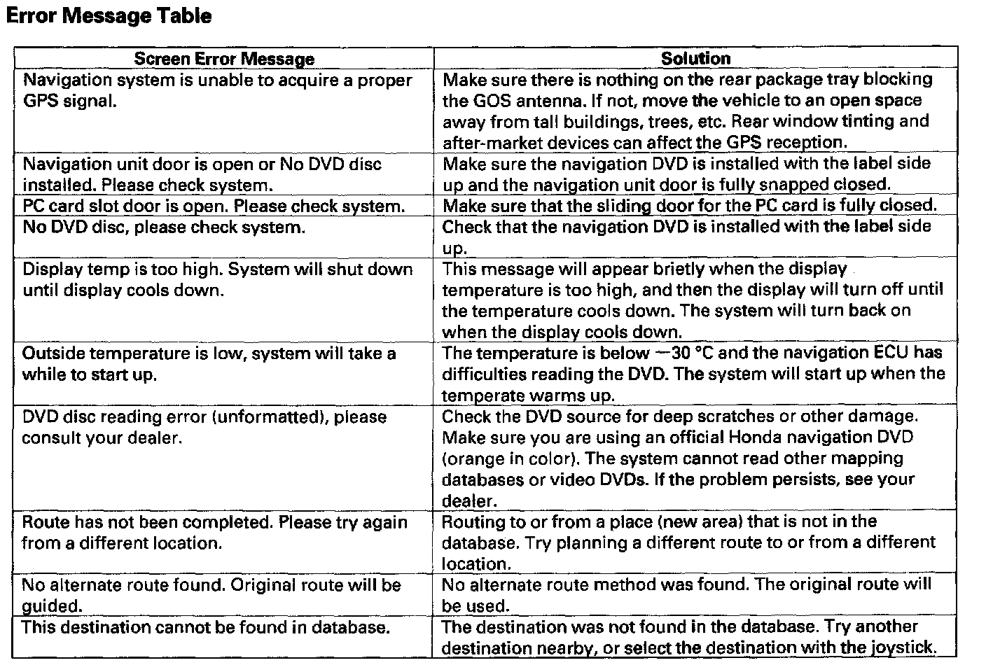 Error Message Table: