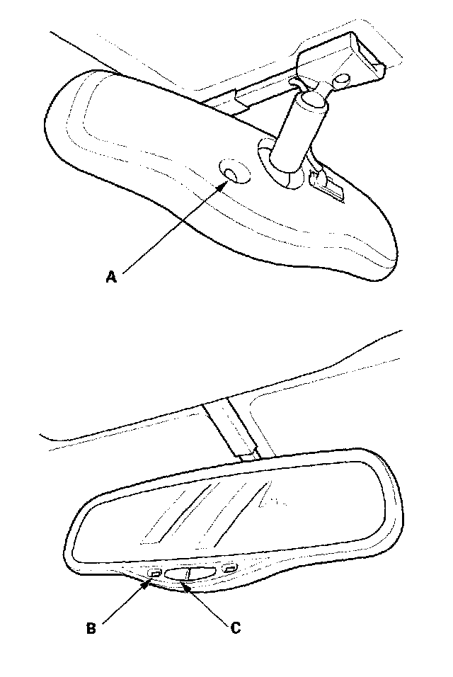 System DescriptionThe automatic dimming inside mirror has a front-facing lux level sensor (A), a rear-facing lux level sensor (B), and a control unit. The control unit receives signals from each sensor. Based on the difference between the two lux levels (the light outside the vehicle and the light from the headlights of the other vehicle, etc.), the control unit controls the electro-chromic gel to reduce the glare. This dimming function is canceled when the transmission is in reverse, or when the automatic dimming off switch (C) is turned OFF.