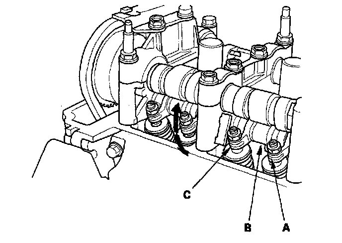 12. With the specified air pressure applied, move the secondary rocker arm (A) for the No. 1 cylinder. The mid rocker arm (B), primary rocker arm (C), and secondary rocker arm should move together.