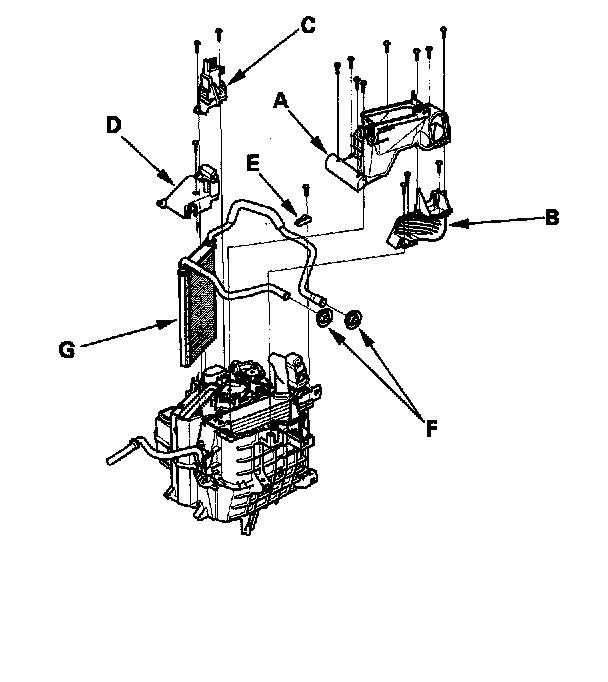 11. Remove the self-tapping screws and the joint duct A, then remove the self-tapping screws and the joint duct B. Remove the self-tapping screws, then remove the passenger's heater outlet (C), and the heater core cover (D). Remove the self-tapping screws, the heater pipe bracket (E), the grommets (F) and carefully pull out the heater core (G) so you don't bend the inlet and outlet pipes.